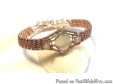 Wire woven bracelet in copper ..the center has an oval light green Prasiolite cabochon also called green amethyst. On the sides of the stone are small round faceted clear Quartz beads.