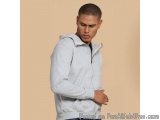 Grey zip-up hoodie with a front zipper, pockets, and a hood with drawstrings